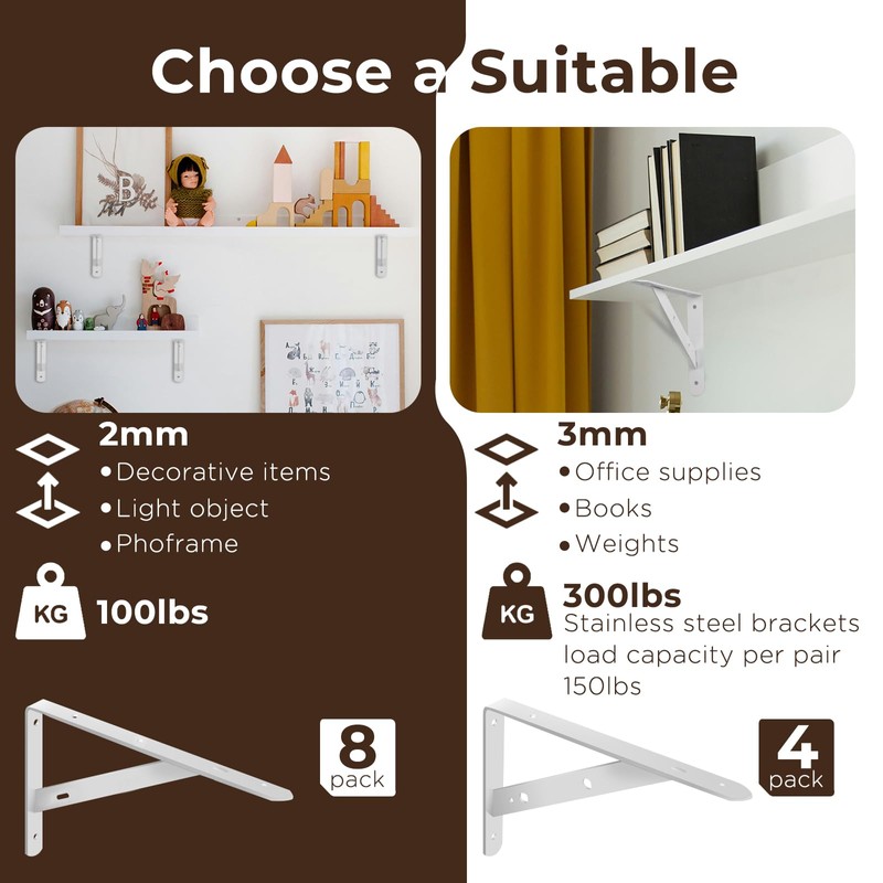 - HIGH QUALITY: Our white shelf brackets are Using the most stable triangle structure,Max load 300 lbs per pair,Sturdy steel material with a white powder-coated finish is durable, chip- and corrosion-resistant.