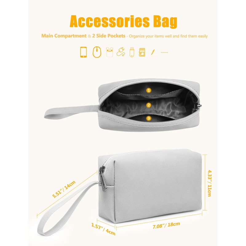 - Multifunctional storage bag: dimensions: 7.08" x 1.57" x 4.33", with 3 inner compartments that allow you to easily store daily electronic accessories in one place and easy to find. There is a handle on the side for easy carrying. Its compact size is extremely flexible and can be carried alone or simply packed into a laptop bag/backpack/suitcase. It can also be used as a cosmetic bag or bag for health care kits and more