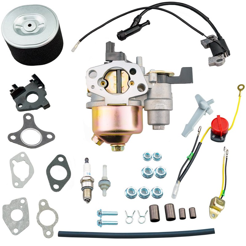 - The kit includes carburetor,ignition coil,insulator,air filter, spark plug,on-off switch, fuel line, clips, muffler gaskets,carburetor,gasket, valve over gasket, nuts for carburetor, muffler and others as pictures show. It fits Honda gx240 and gx270 engines and power equipment with these engines