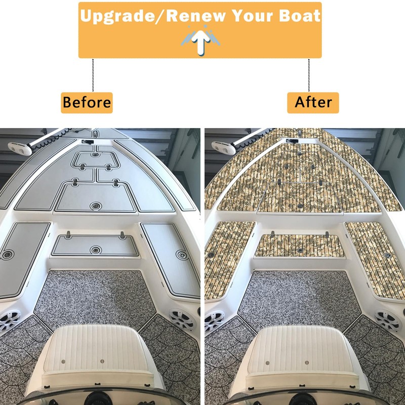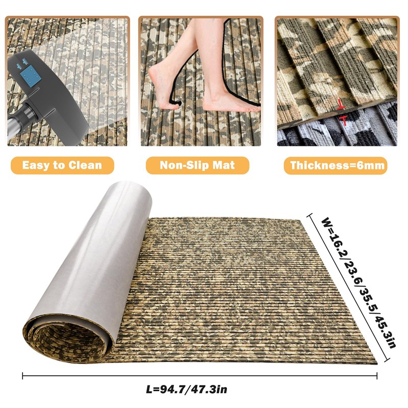 • WHY CHOOSE US?---This Camo boat flooring eva foam with deep striped grooves designed by HZCHIONE's own which will increase friction to prevent sliding and allow water to run off quickly.Decorating and upgrading your boat by personalized camouflage marine flooring carpet. This grooves of foam boat mat is EASY TO CLEAN and EASY TO CUT. This EVA foam boat mat can be cleaned with broom, vacuum cleaner.