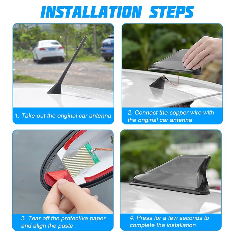 - Easy to Install: This car shark fin antenna is easy to install with self-adhesive mounting, no drilling required. First, you should remove your car's old antenna and wipe the side locations clean. Then, you just need to peel off to stick it to the target location and press gently for a few seconds to make sure it sticks firmly. This car shark fin antenna is firmly installed and not easy to fall off.