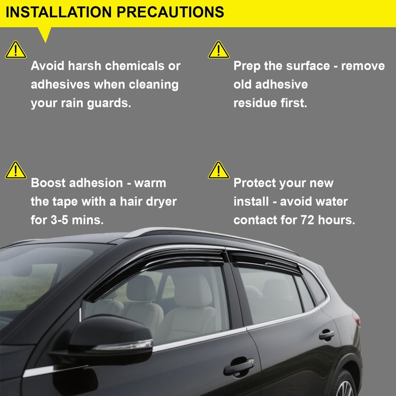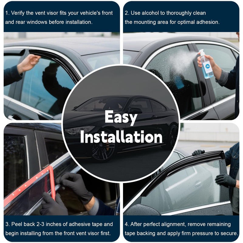 • INSTALLATION PROCEDURE:1.Clean-Wipe the window frame with alcohol 2.Test-Fit-Align the visor to check placement 3.Peel-Remove backing from adhesive tape 4.Stick-Press visor firmly onto the frame 5.Hold-Apply pressure for 30 seconds