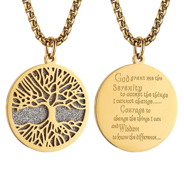 HZMAN Stainless Steel Gold Silver Tree of Life Serenity Prayer Necklace Pendant Zircon Inlaid for Men Women Jewelry Gift (Gold)