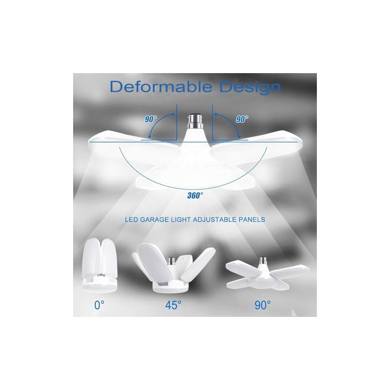 • Super Bright Adjustable Design : LED Garage light provides a 6800 lumen output in 6500K daylight white. There is 1 circular LED lamp and 4 bright LED panels with upward wide angle adjustable design, for cover a wider area.