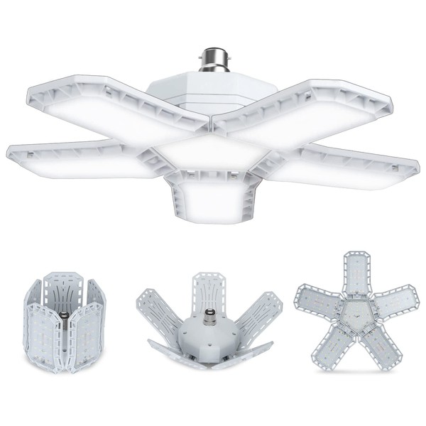 HZSANUE HZSANUE B22 Bayonet LED Garage Light 80W, 3500K Warm White 9000Lm Deformable Workshop Lamp with 5 Adjustable Panels, LED Ceiling Lighting, for Garages, Basement, Warehouse, Attic, Gym (Pack of 1)