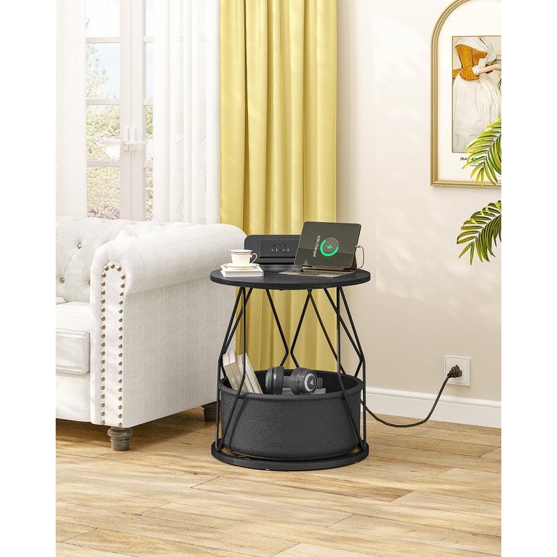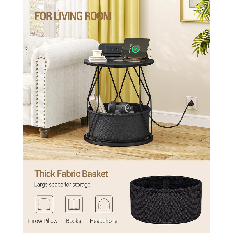 Hzuaneri Side Table with Charging Station, Round End Table with Storage Basket, Small Nightstand, Bedside Table, for Living Room, Bedroom, Black ET55004B