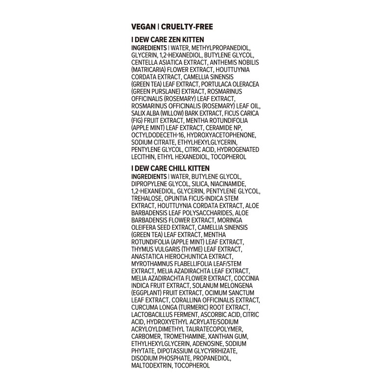 - ✅KEY INGREDIENTS: Centella Asiatica- helps strengthen the skin's barrier (Zen Kitten) | Prickly Pear Extract- is rich in Vitamins A, B, C, and other minerals to help protect and hydrate the skin (Chill Kitten) | Heartleaf Extract- works to clarify and calm the complexion (both products).