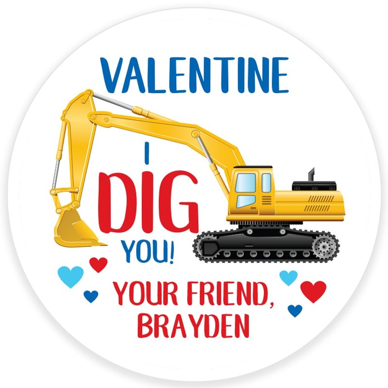 I Dig You Valentines Day Stickers, Kids Construction Valentines Day Cards, Treat Bag Stickers, Classroom Valentines - Set of 24 Stickers