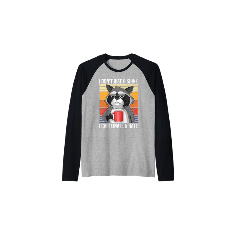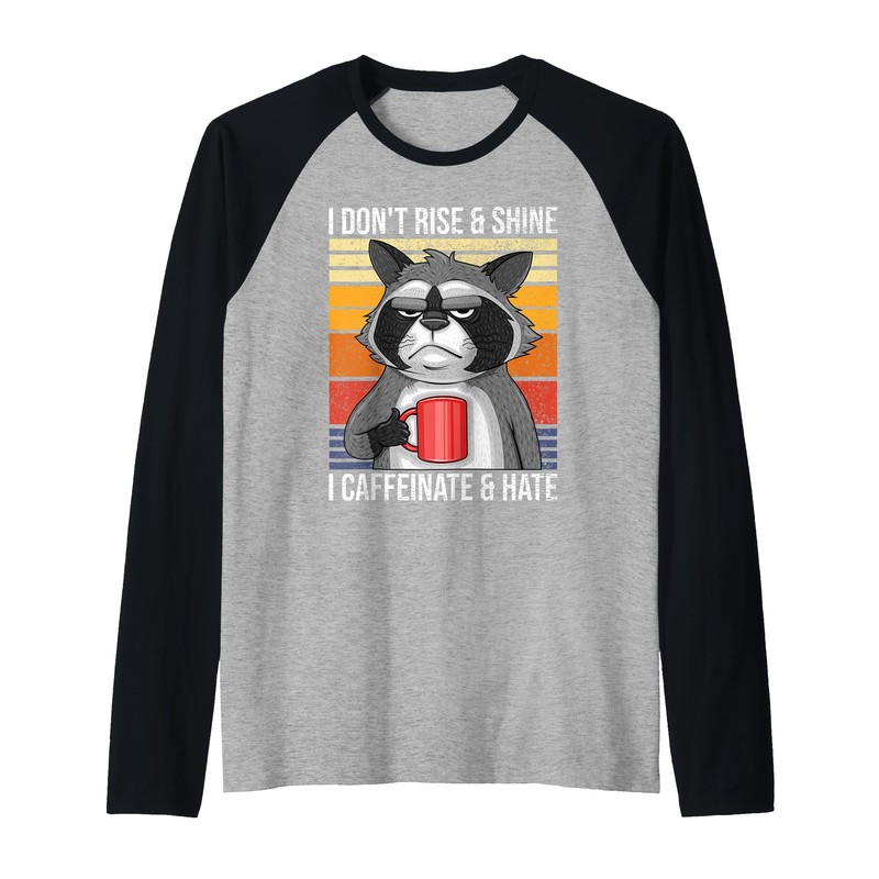 I Don't Rise & Shine I Caffeinate and Hate Coffee Raccoon Raglan Baseball Tee