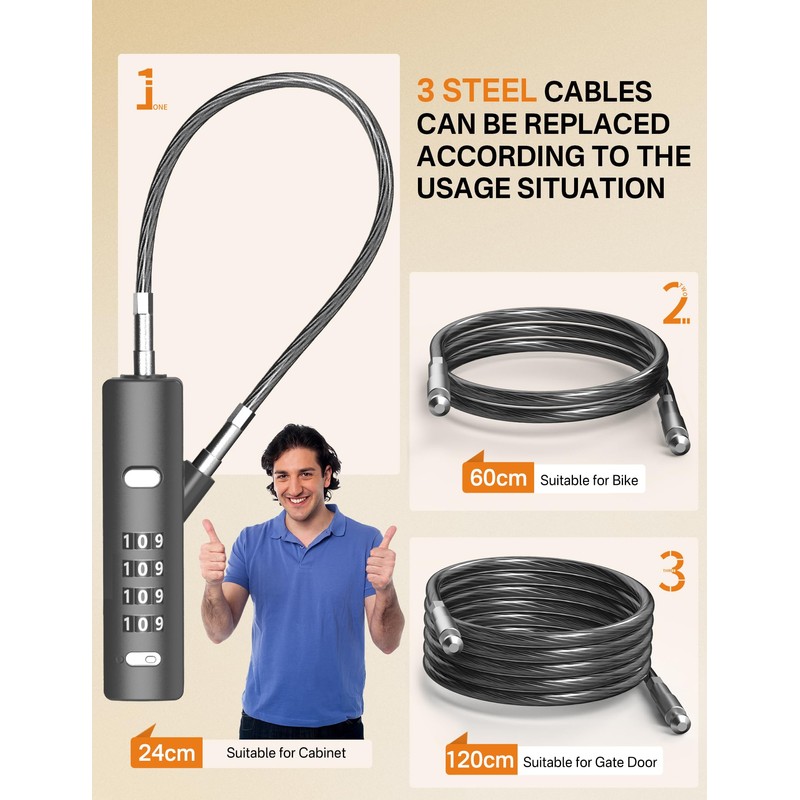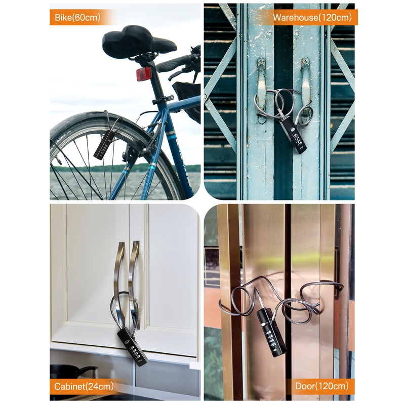- 【3 Replaceable Ropes】: This Combination Rope Lock comes with three flexible steel cables in lengths of 9." (23 cm), 23.6" (60 cm), and 47.2"(120 cm). The cables can be easily detached and replaced to suit various scenarios, such as cabinet doors, bicycles, and small doors