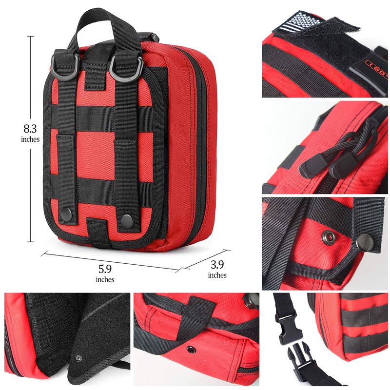 I GO Survival First Aid Kit, 251 Pieces Compact Tactical Trauma First Aid Bag, Molle Compatible Emergency Pouch for Outdoor Camping Hiking Backpacking and Travel, Red