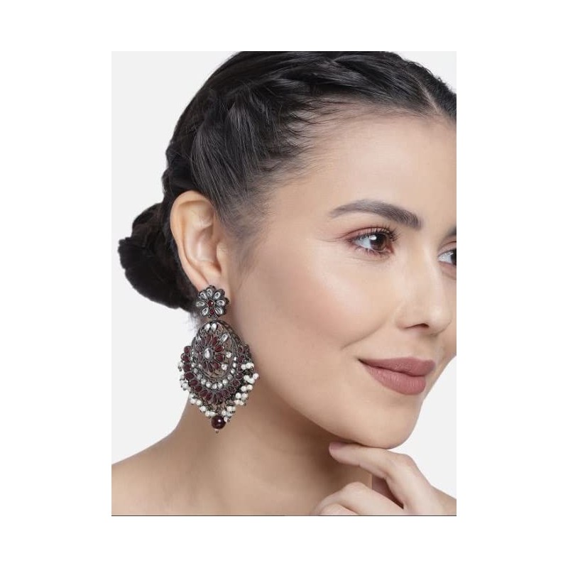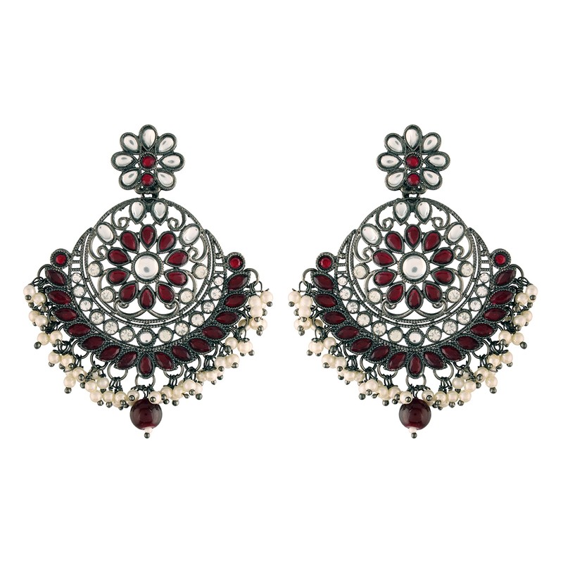 I Jewels Womens 18K Silver Oxidised Indian Wedding Bollywood Kundan & Stone Studded Chandbali Earrings (E2947Zm) Maroon