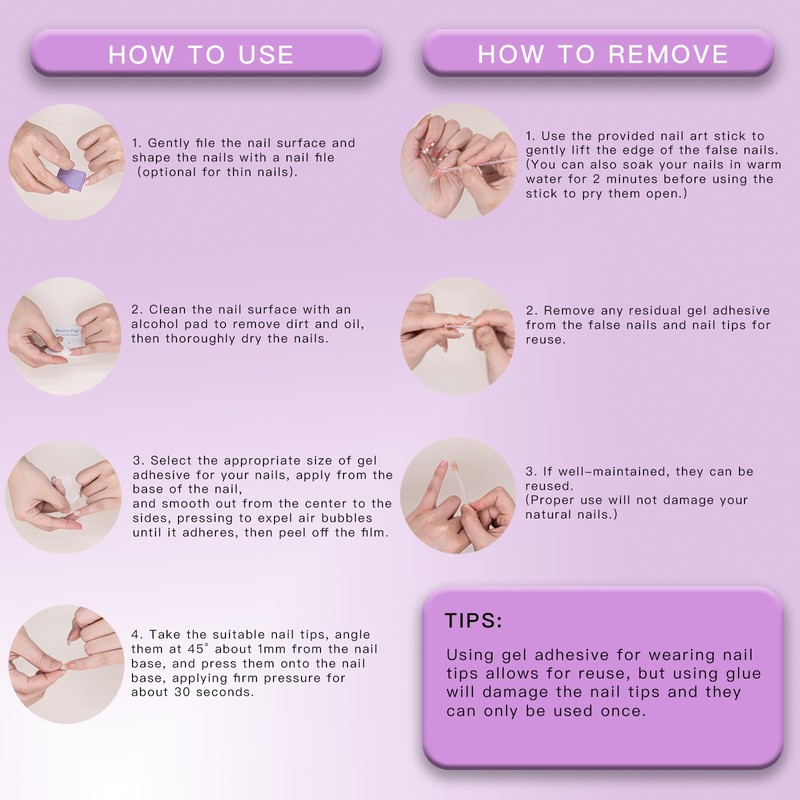- Each set includes - 48 adhesive tabs (for easy application), 1 nail file (for shaping), 1 cuticle stick (for easy removal), 2 alcohol prep pads and 10+5 handmade Press-On nails for more options. Important: Do NOT use alcohol on the press-on nails themselves to avoid damaging the finish.