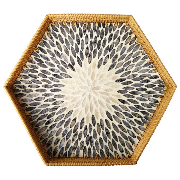 i-LAN 17”Extra Large Hexagonal Rattan and MOP Woven Basket Tray, Boho Wicker Coffee Table Serving Basket Décor with 2 Inch Wall, Handmade Hexangular Display Basket for Countertop