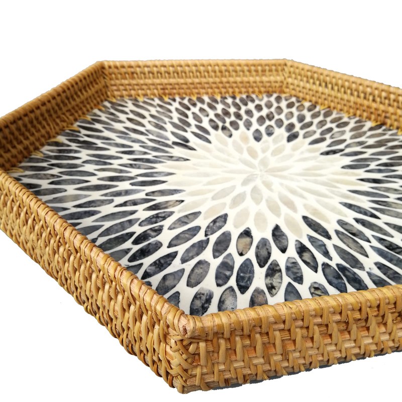 - Handwoven Ottoman Basket Tray: Made of rattan with beige black mother of pearl flat bottom, sturdy and easy-care with soft shades.