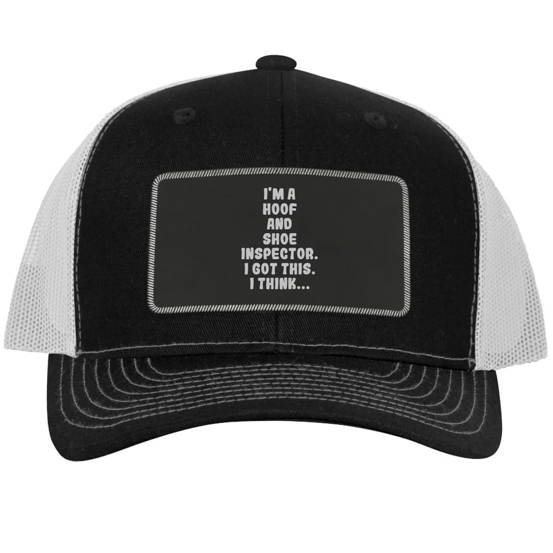 I'm A Hoof and Shoe Inspector. I Got This. I Think... - Leather Black Patch Engraved Trucker Hat, Black-White, One Size
