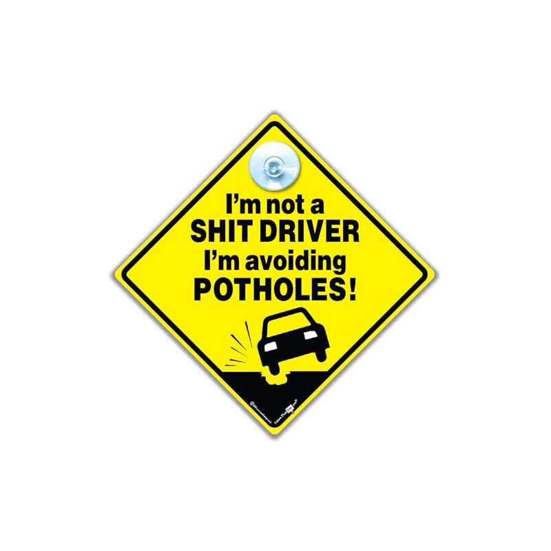 I'm Not a Shit Driver I'm Avoiding Potholes, 14 x 14 cm, Yellow Diamond with Suction Cup, Joke Bad Driver Sign, Pothole Sign