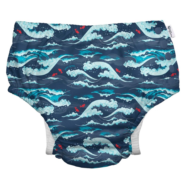 i play. by green sprouts Reusable, Eco Snap Swim Diaper with Gussets, UPF 5, 4T, Navy Tidal Waves, Patented Design, STANDARD 100 by OEKO-TEX Certified