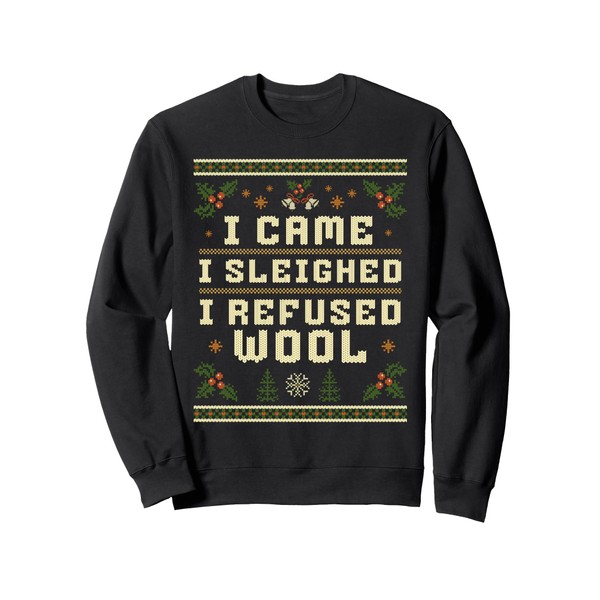 - Funny, low-budget ugly sweater design featuring the pun "I Came, I Sleighed, I Refused Wool." Perfect for Christmas pajama parties or festive gatherings. Celebrate the XMAS Holidays in sarcastic style with this witty and cozy PJ design