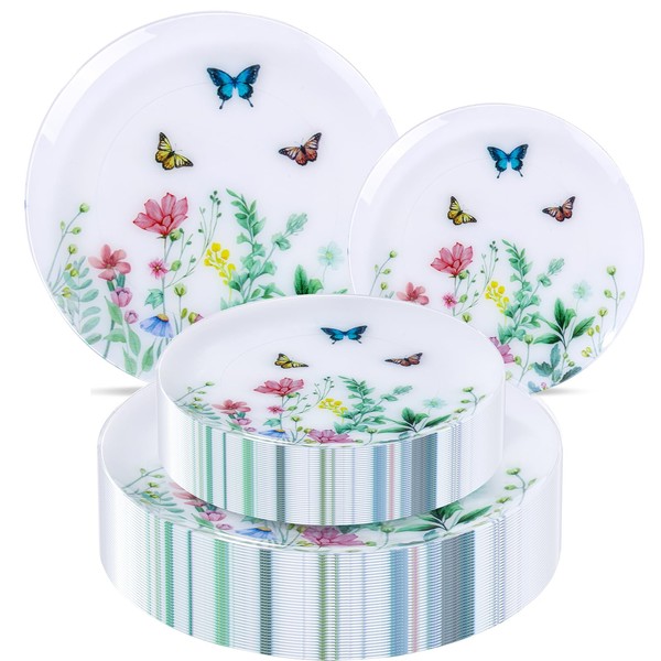 I00000 20Pcs Wildflower Plastic Plates,Spring Party Decorations,Butterfly Floral Plastic Dinnerware Set Include 10Pcs Dinner and 10 Pcs Dessert Plates for Mother's Day Dinner Party Supplies