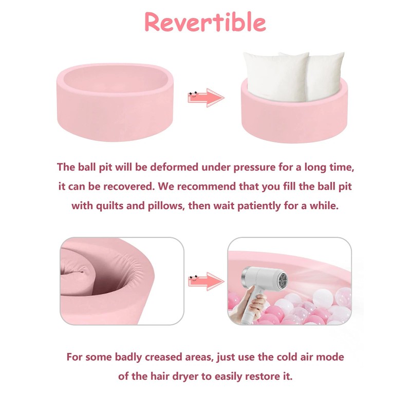 Vacuum Seal Design: The pink ball pit will be packaged in a vacuum-sealed bag, it will be restored within 2-5 days after installation (the recovery process will not affect the utilization). Use the hair dryer at a moderate temperature to help shape recovery.