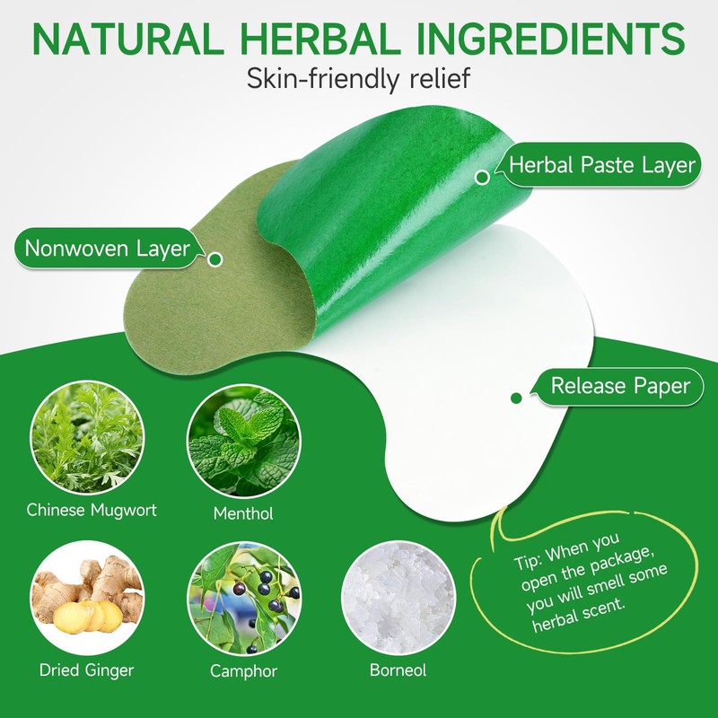 Embrace Nature's Comfort: Mugwort & Herbal Knee PatchExperience Deep, Soothing Comfort C The Herbal WayExperience targeted, lasting relief with our Herbal Comfort Knee PatchC crafted for those seeking a natural approach to joint and muscle discomfort. Blending traditional wisdom with botanical science, each green patch delivers a unique gentle, penetrating warmth through through its powerful yet gentle formula: Key Benefits: Multi-Ingredient Synergy: Harnesses Mugwort, Menthol, Dry Ginger, Borneol, and Camphor C a time-tested herbal alliance that works harmoniously to soothe weary knees, stiff shoulders, lower back, and elbows. Natural Self-Warming Action: Feel refreshing coolness (Menthol) melt into comforting warmth (Ginger) for temporary relief that adapts to your body's needs. Dry Ginger and Mugwort work synergistically to create a soothing thermal experience. All-Day Support: Stays securely in place during movement, sleep, or work. Herbal benefits linger for up to 8 hours, extending your comfort. Flexible & Versatile: Ultra-thin, breathable design moves naturally with your body. Apply anywhere C perfect for post-workout recovery, long commutes, or desk fatigue. Helping you feel revitalized during activity or rest. Versatile Full-Body Support: Apply not just to knees C perfect for stiff shoulders, lower back, elbows, or other tense muscles.Ideal For:Active lifestyles needing joint supportPost-activity Joint or muscle tirednessDaily discomfort after long work hoursJoint stiffness from weather changesSeeking natural alternatives for temporary relief Pure & Purposeful:No harsh synthetics. Just plant-powered care designed for your wellbeing.Note: For external use only. Discontinue if irritation occurs.