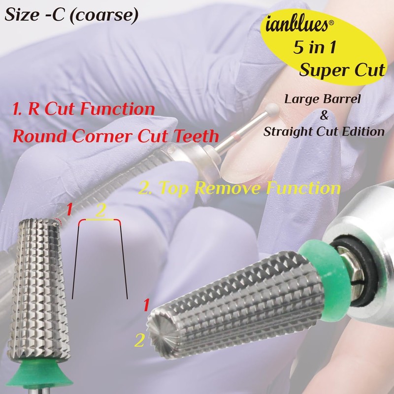 - 5 in 1 Mul-functions: Upgrade from 5 in 1 nail drill bit, the super cut series’ functions are almost the same with original. 3 sizes file-teeth in 1. R cut function. And super cut function.