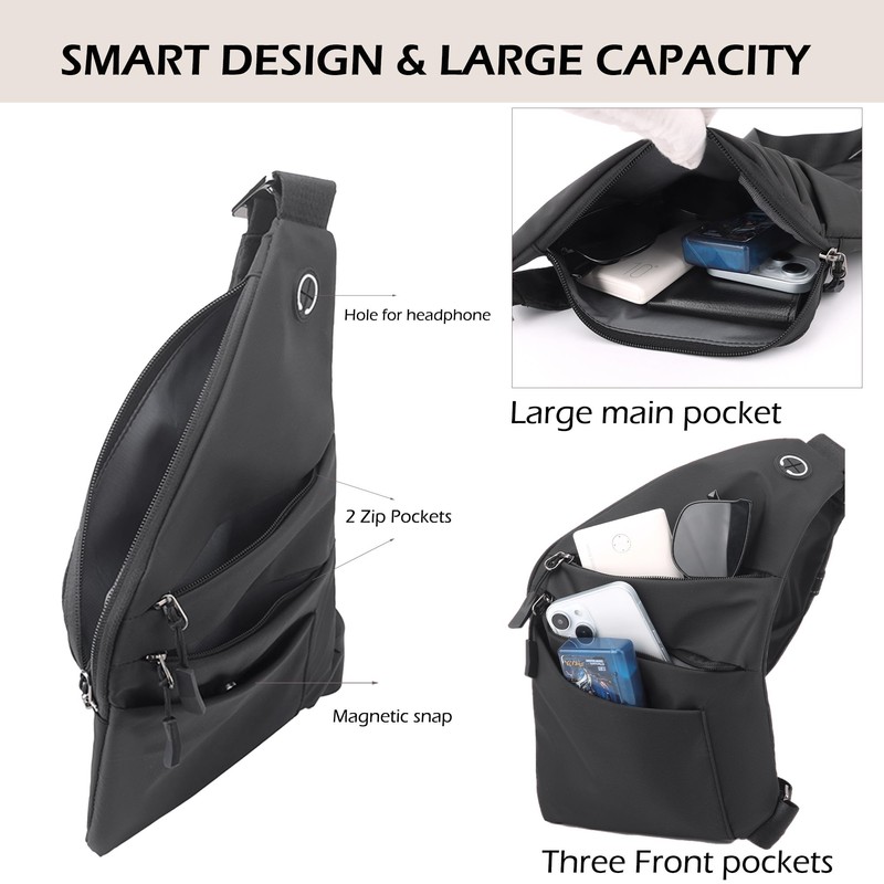 - Thoughtful structure shoulder bag: main compartment + 2 front pockets + magnetic closure compartment + hidden anti-theft back pocket. Special headphone hole in the front pocket - Perfectly organised for smartphone, wallet and keys. The practical women's chest pocket for work, travel and leisure.