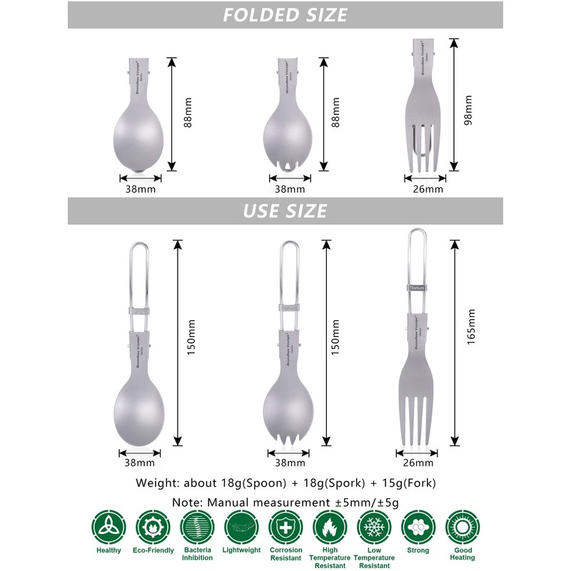 • Ti1021T spoon: with size (L) 150 x (W) 40 mm, folding size: (L) 80 x (D) 38 mm; approx. 18 g.