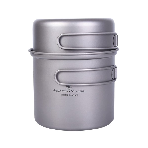 iBasingo Titanium Pot Pan Set Lightweight Camping Cookware Outdoor Kitchen Bowl Dish Set Portable Cooking Kit with Folding Handle Travel Tableware Mess Kit for 1-2 People Ti2038C
