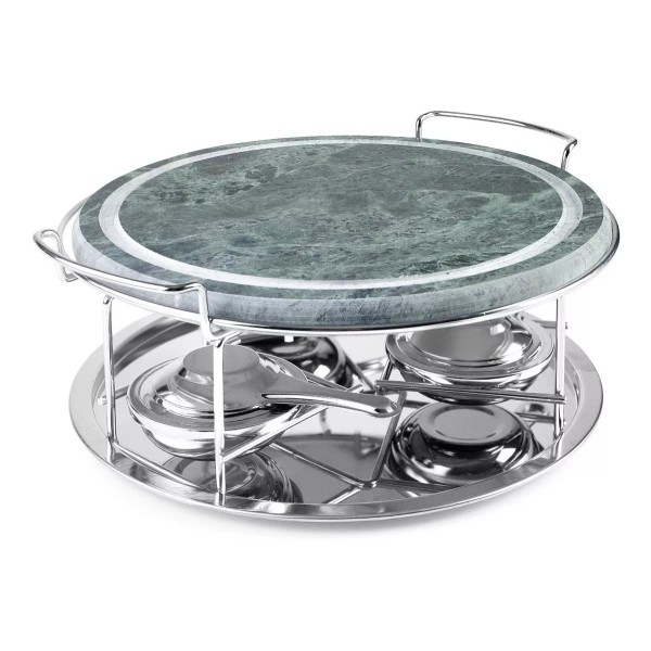 El grill de piedra utiliza un sistema de cocción natural, al no utilizar grasas todo lo cocinaremos conservando el sabor natural de los alimentos. Tiene 3 lamparillas de alcohol, debajo de la piedra en una bandeja de acero y estas calientan la piedra y mantienen el calor durante la comida. Ocupa poco espacio. El grill de piedra
