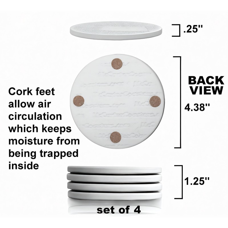 • Set of 4 - Measures 4 3/8" diameter with cork feet to allow air circulation which prevents moisture from being trapped on the inside and the bottom. Dishwasher safe - You will NOT be disappointed!