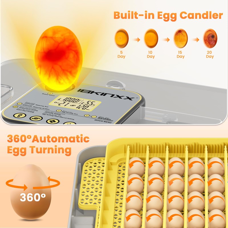IBKINXX Incubator for Hatching Eggs-48 Egg Capacity, Auto Egg Turner & New Auto Precision Humidity Control System, 360° Clear Viewing for Chicken, Duck and Quail Eggs