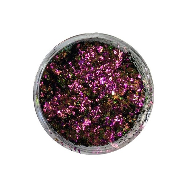 Chameleon Flake is supplied in 5ml cosmetic pots and the flake size is a range of flake shaped particles of 50-350 microns. Each pot holds 1g of powder. First apply your chosen base colour gel, black will give you the most dramatic effect, however other colours will create a different final effect. Apply this pigment over a tacky gel polish top coat, ensuring it is cured before application. For best results apply with a pigment brush however you can experiment with other tools to give smooth or textured effects. Finally apply a no wipe top coat and cure. NB whilst some colours look similar they are all different, they each have a different shades of colour