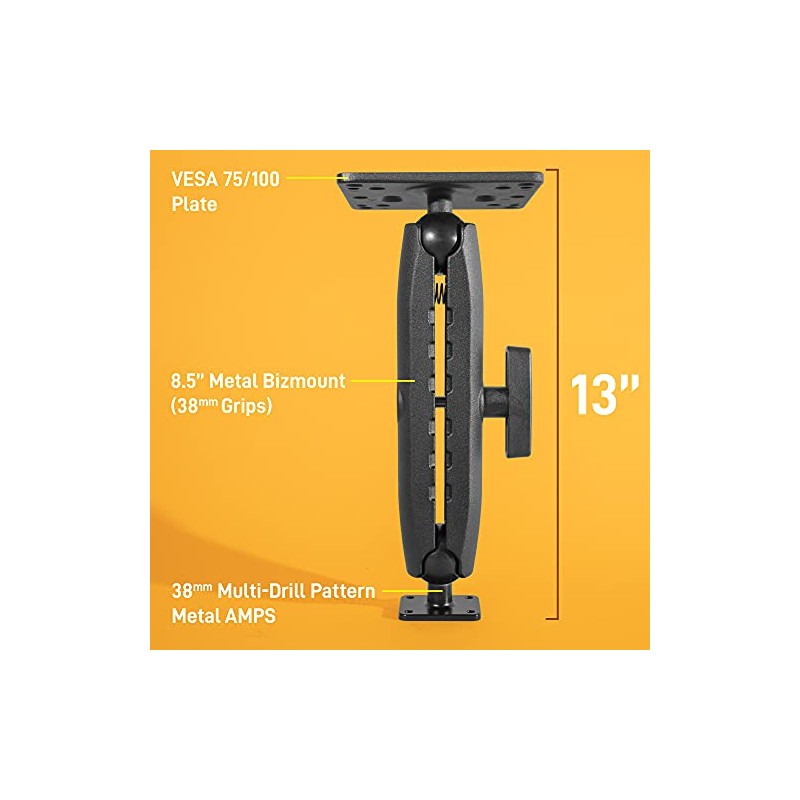 - Includes: 8.5 inch Aluminum 38mm Bizmount Arm, and (1) 38mm / 1.5 inch Metal Rectangular AMPS pattern ball mount, and (1) Metal VESA 75 x 75 / VESA 100 x 100 plate.