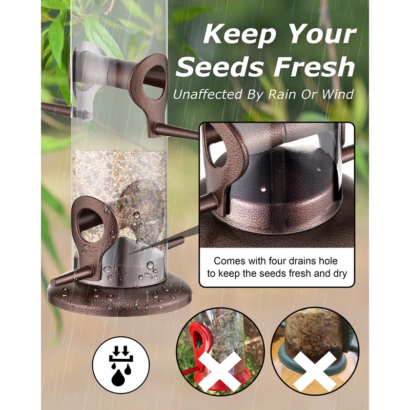 - 【Metal Bird Feeder】Metal top & base, aluminium feeding ports survived from Squirrel Damaging. Durable quality to sustain wear and worn outdoors. We adopt advanced technique for metal finishing to help the metal last longer when used outdoors.