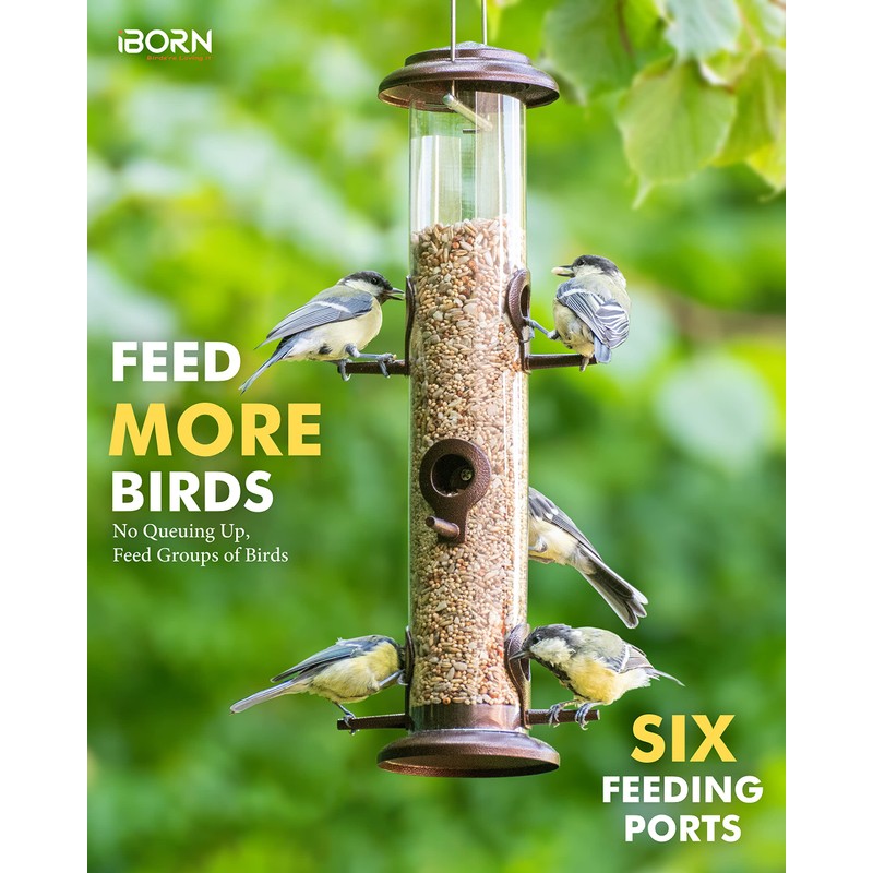 - 【Six Feeding Ports】In different weather and lack of food supplies, birds need more energy and food to survive. Six feeding ports with perches allows for multiple birds to feed simultaneously,bring enough food for the birds and attract more birds to your garden.