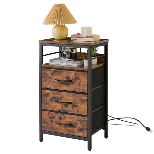 IBUYKE Nightstand with Charging Station,Side Table with Fabric Drawers, Bedside Table with USB Ports and Outlets, End Table for Bedroom, Living Room, Rustic Brown UTNS001H