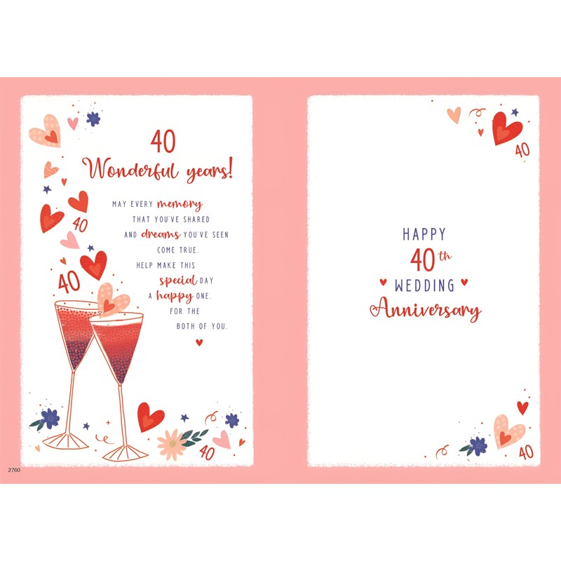 - GREETING INSIDE: This card features a beautifully illustrated insert leaf, reading 40 Wonderful years! May every memory that you've shared and dreams you've seen come true, help make this special day a happy one, for the both of you. Happy 40th Wedding Anniversary', leaving plenty of space to add your own personal handwritten message.