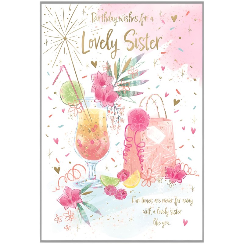 IC&G Lovely Sister Birthday Card - Happy Birthday Card with Floral Cocktail and Confetti Design and Embossed Foil and Flitter Details - Birthday Card for Women