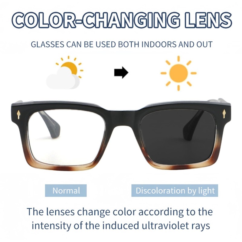 - Non-bifocals! Swift Photochromic Adaptability: Our Photochromic Reading Glasses, suitable for both genders, exhibit rapid color transformation. Within minutes, the lens shifts from clear to light or dark gray in response to sunlight and UV levels, and promptly reverts indoors. Ideal for diverse outdoor pursuits such as fishing, camping, beach trips, and poolside relaxation, serving as reading glasses inside and stylish reader sunglasses outside.