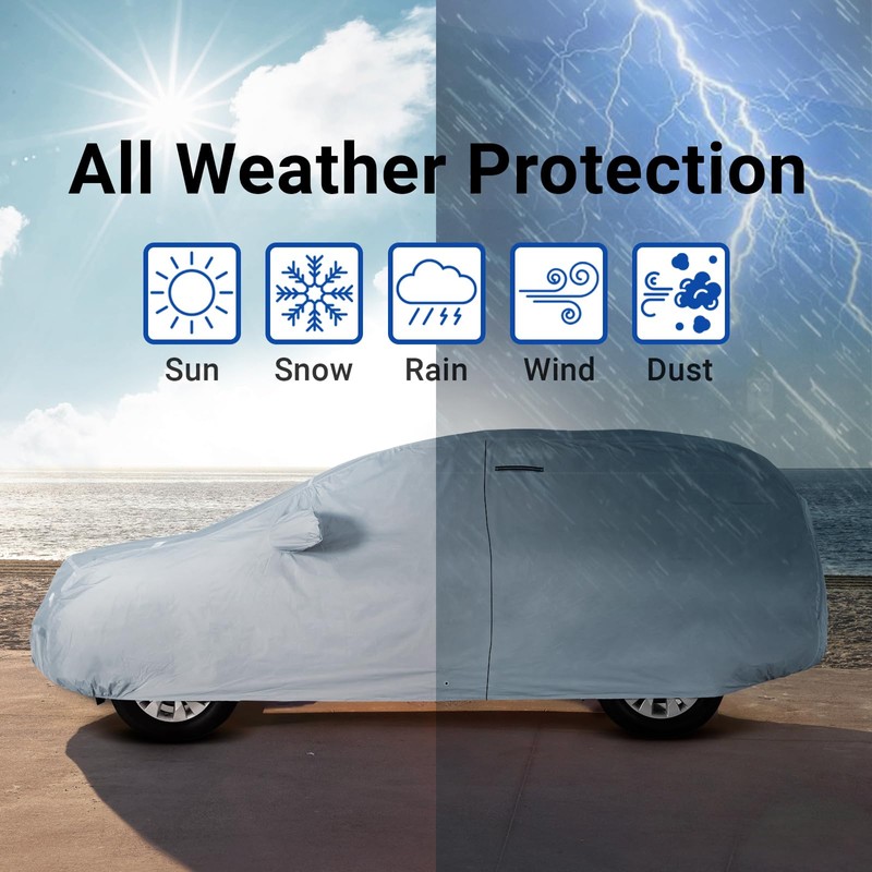 - COMPLETE WEATHER AND WATERPROOF PROTECTION: Our all-weather car cover is made from 100% waterproof and weatherproof materials, protecting your car from rain, snow, hail, and sun. It offers full UV defense to preserve your paint and finish, while the soft cotton lining prevents scratches.