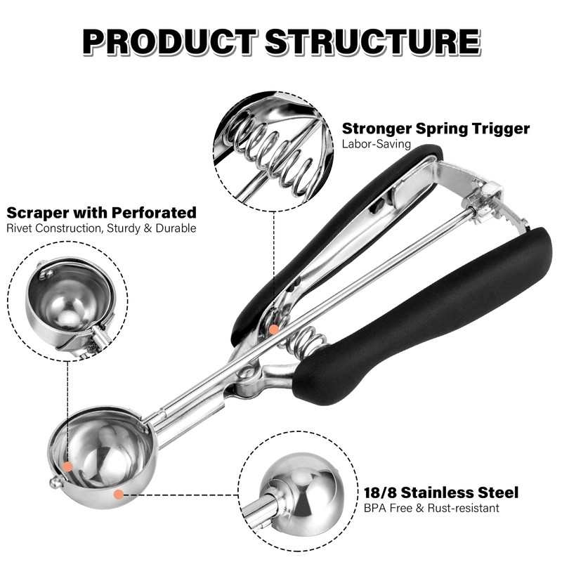 • 🍨【Premium Quality】Crafted from 18/8 stainless steel, this scoop is rust-resistant, chip-resistant, and built to last. You can have confidence in the safety and durability of this kitchen tool. Easy to clean, dishwasher safe, it is recommended to hand wash to maintain gloss.