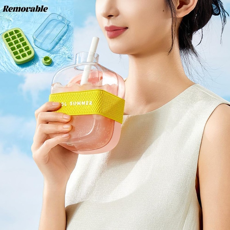 Ice Cube Bottle, 2 in 1 Touch-Free Ice Cube Tray Water Bottle with Lid and Bin, Ice Cube Making Bottle with Straw & Strap, Perfect for Juice, Coffee, Soda and Other Beverages