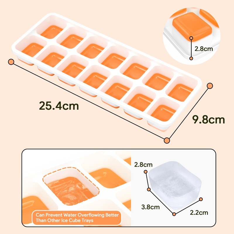 Easy to fill, easy to use and easy to clean, these trays are dishwasher safe. Each ice tray makes 14 nice-sized ice cubes. You just need to fill the trays with water/ice cream/soda/wine, and then cover the lid and put them into the freezer