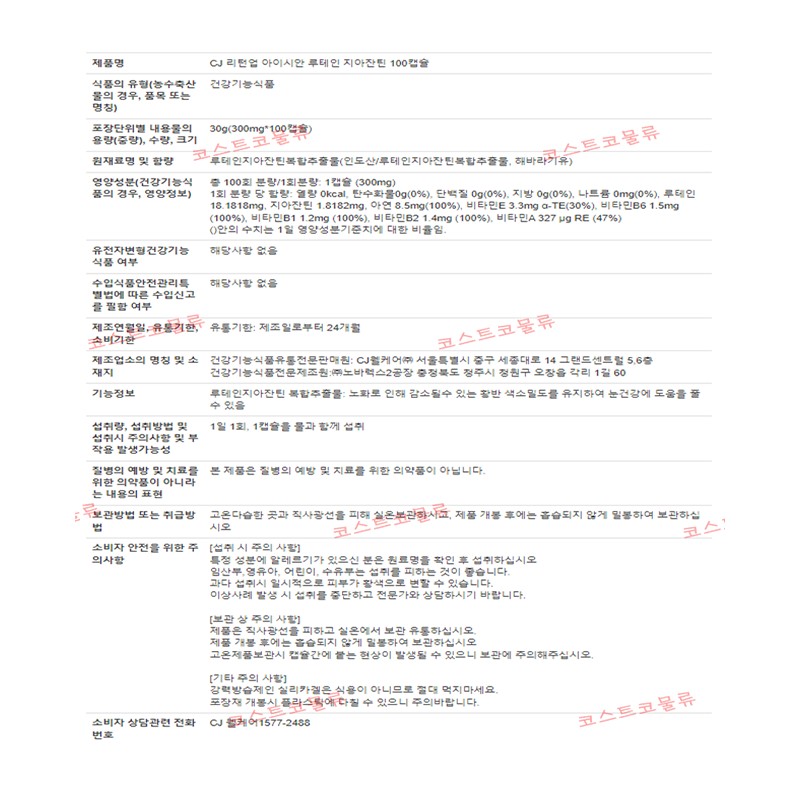 - 기능정보: 루테인지아잔틴 복합추출물: 노화로 인해 감소될수 있는 황반 색소밀도를 유지하여 눈건강에 도움을 줄 수 있음