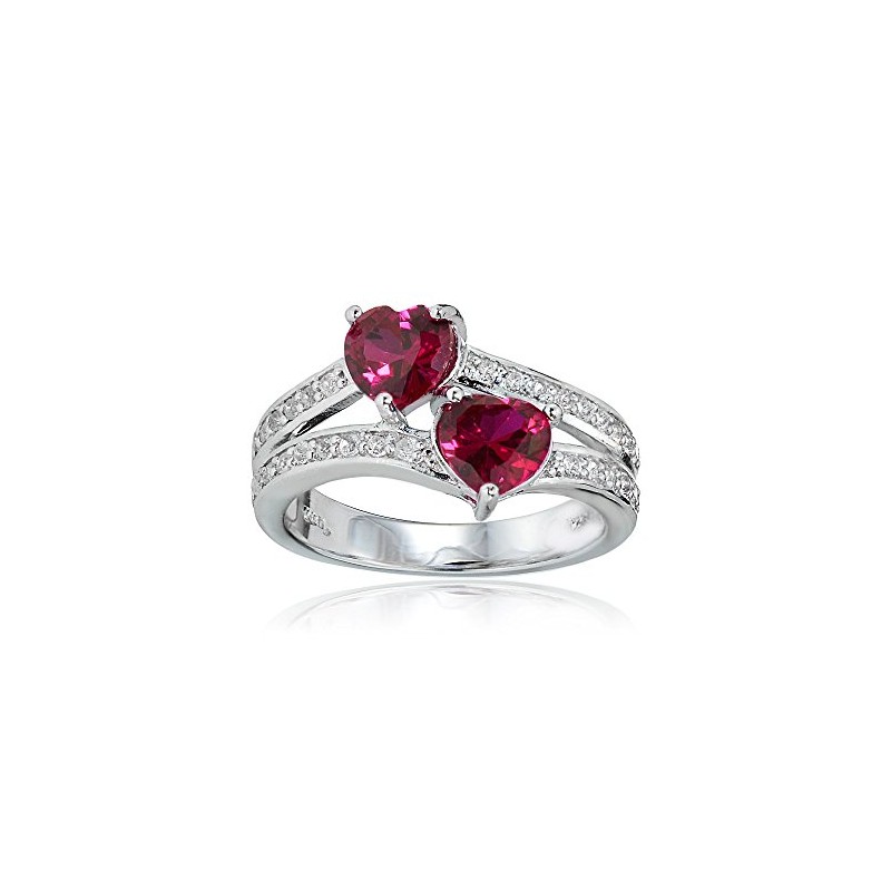 Ice Gems Sterling Silver Created Ruby and White Topaz Double Heart Friendship Ring, Size 6