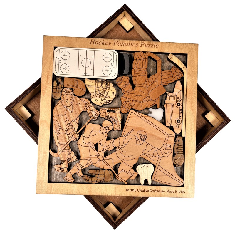Pieces are all precision cut and laser etched from 1/4” thick hardwoods for both beauty and durability. We also have a couple teeth from white acrylic and a puck from black acrylic. Pieces also include a Zamboni, Goalie making save, skates, gloves, pads, stick, mask, whistle, rink layout, and player. Measures about 7.5” square in the frame and cover. Can be custom laser engraved with a name or message on the cover. An original Creative Crafthouse design made in our Florida shop.