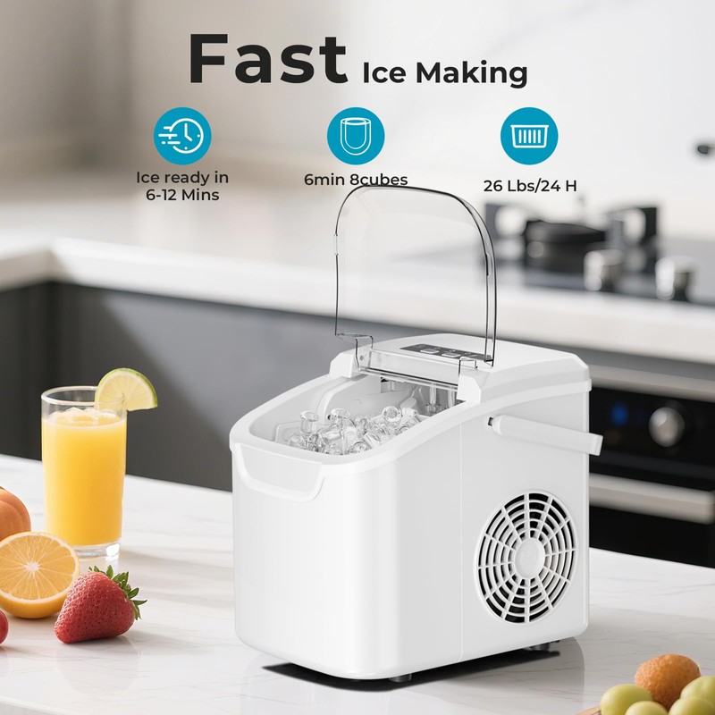 - High-Efficiency Production:Compact ice machine generates 8 fresh bullets per 6-13 minute cycle (26lbs/24hrs) with whisper-quiet operation, featuring visible water window and overflow protection.