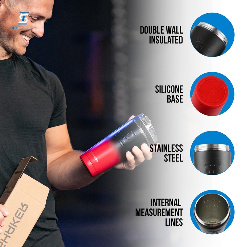 Ice Shaker Ice Shaker Insulated Stainless Steel Shaker Bottle | 26oz, Red/black | Cold for 30+ Hours | Insulated Cup with Twist-on Agitator | Odor-Free Bottle for Protein Shakes, Water, Smoothies, Cocktails